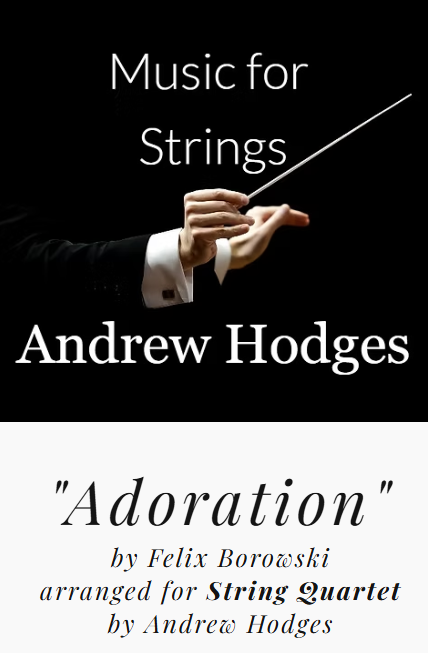 Andrew Hodges’ arrangement of Felix Borowski’s “Adoration” for string quartet is a well-crafted and enjoyable piece to play. It faithfully captures the spirit and beauty of the original composition, while also exploiting the unique timbral and expressive capabilities of the string quartet. Andrew’s arrangement of Borowski’s “Adoration” is a high-quality piece that string quartets will enjoy playing. It is well-written, technically accessible, and musically rewarding. It is a beautiful and moving piece of music that is sure to engage both the performers and the audience. Andrew’s arrangement of “Adoration” comes highly recommended to any string quartet looking for a new and exciting piece to add to their repertoire.