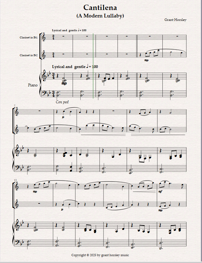 “Cantilena” from the Italian for lullaby, is a modern type of lullaby in concert B flat major in triple time. Ideal for Christmas, Weddings, Concerts etc, Scored for Clarinet duet and piano with both instrumental parts equally sharing the material.
