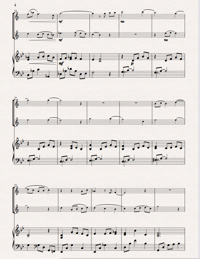 It’s not unlike a barcarolle in tempo and mood- although there are elements of folk and romantic ideas present. It is designed to be restful and peaceful- It is in ternary form with a 4 bar intro and a similar outro. The Clarinet ranges are about 2 octaves with nothing higher than a top B flat. Rhythmically, it is almost all eighths, quarters, half notes and dotted half notes.