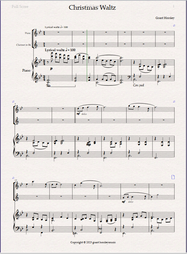 I wanted this piece to convey the feeling of the shared warmth of having family and friends meeting over the festive season when everything is done, and now it’s time to enjoy! Written in Concert B flat major the introduction begins with a bell- like Christmas chime settling into the main theme which is almost like a verse and chorus. The piece has two of these sections with a link between the two. The second section is a different treatment to the first as some of the bell like figurations of the opening are incorporated.