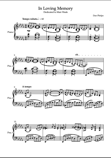 Solo piano piece. Commissioned by John Wade and Dedicated to the memory of Mair Wade