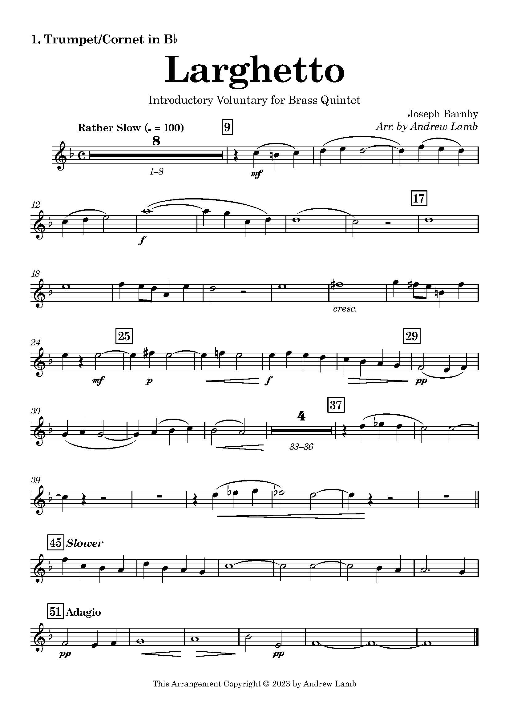 Joseph Barnby’s Larghetto is a work of serene lyricism and warm Victorian expressiveness. This brass quintet arrangement preserves the gentle, hymn‑like character of the original while giving each player a meaningful, resonant role within the ensemble.