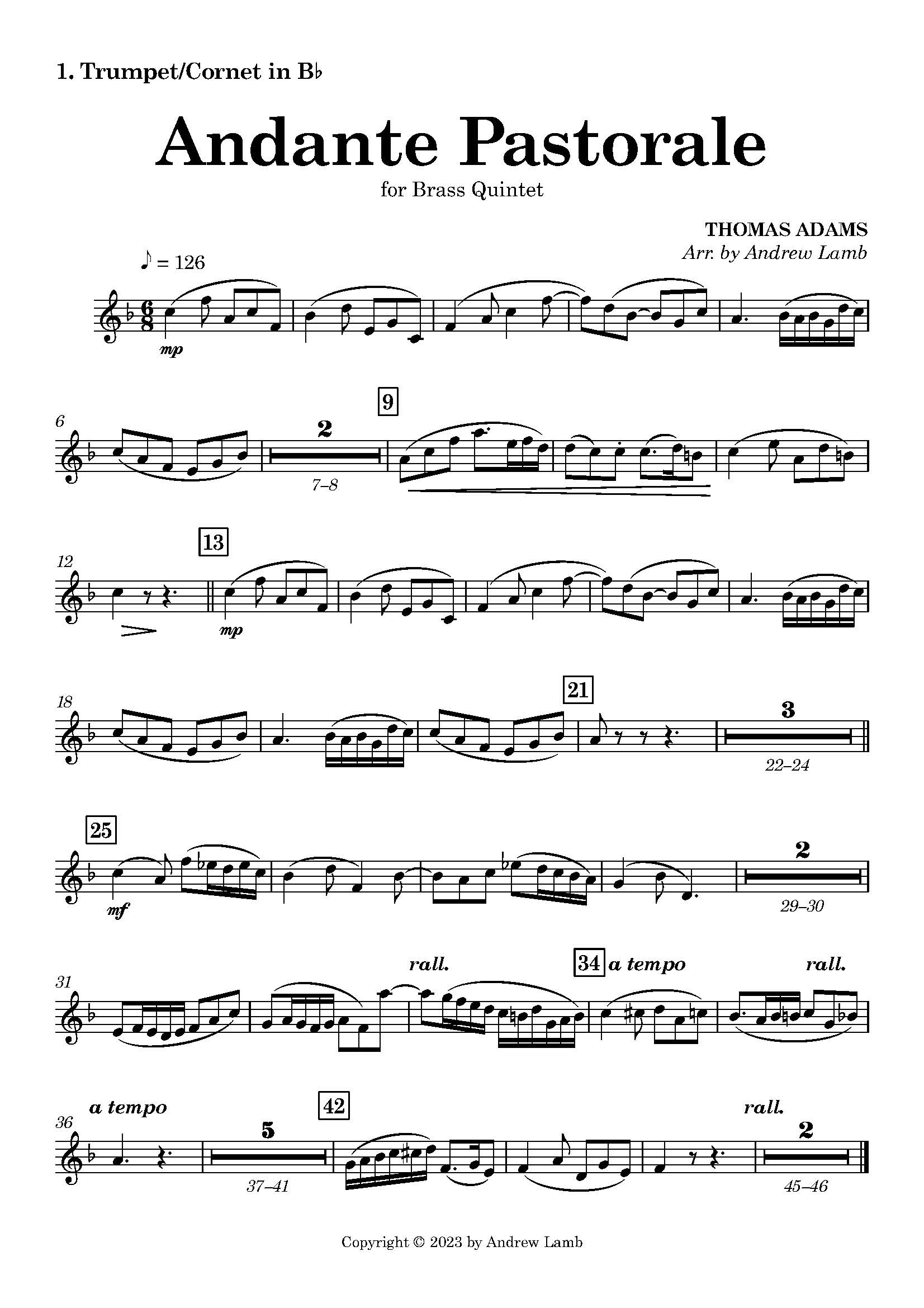 This beautiful arrangement of “Andante Pastorale” by the renowned English composer Thomas Adams is perfect for your next concert or recital! Scored for a flexible Brass Quintet, it includes: