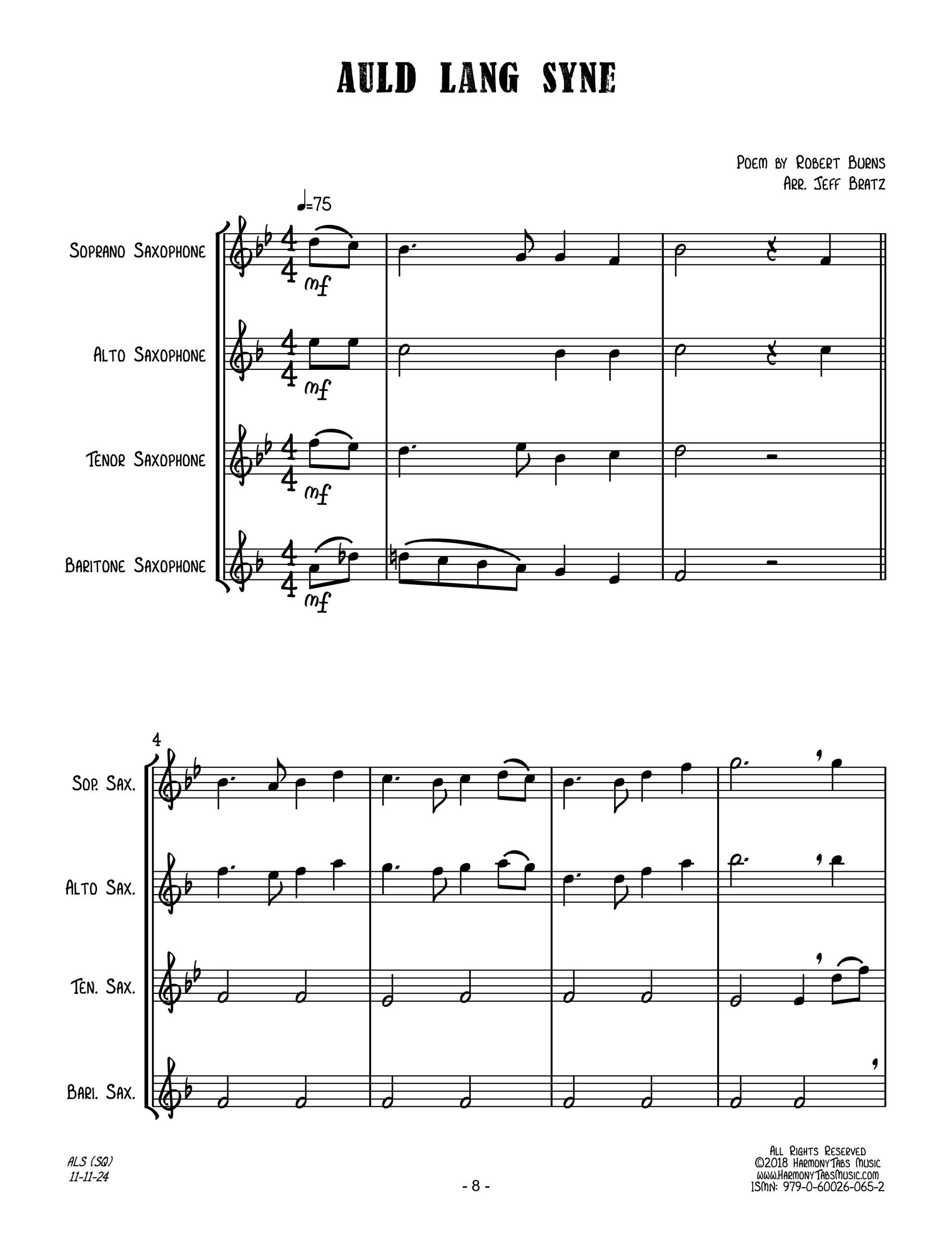 | Based on a poem by Robert Burns. An SATB sax quartet caroling arrangement of Auld Lang Syne. |