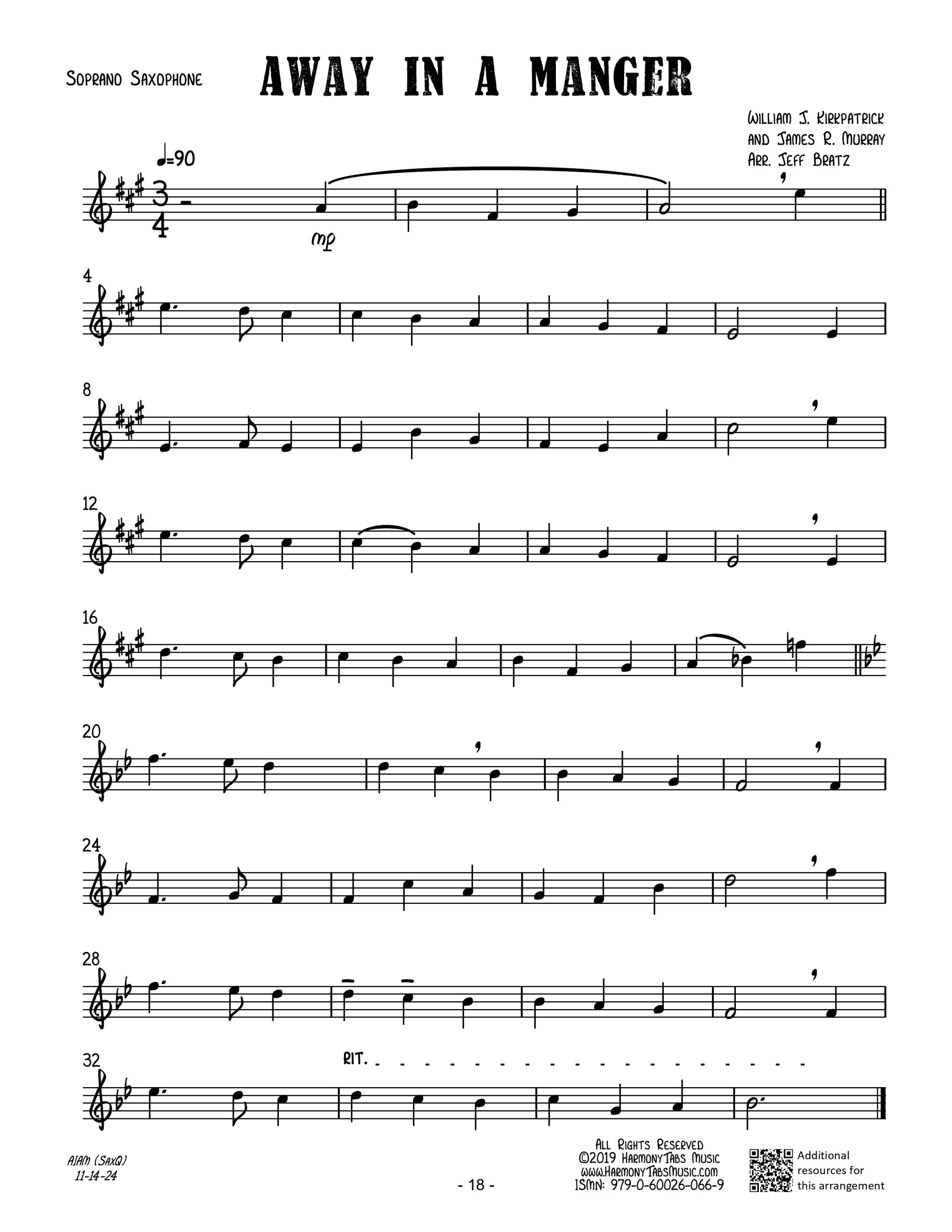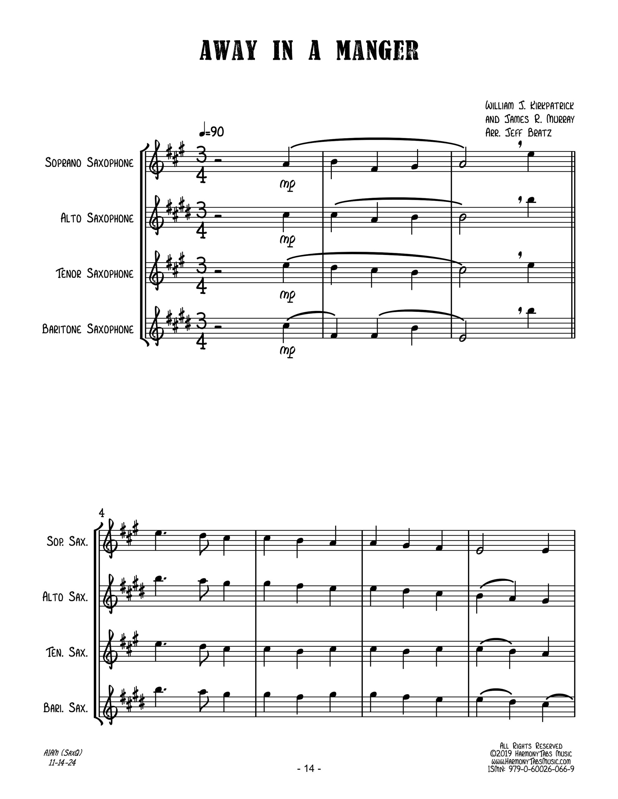 | An SATB sax quartet arrangement of Away In A Manger. Ideal for holiday caroling! |
