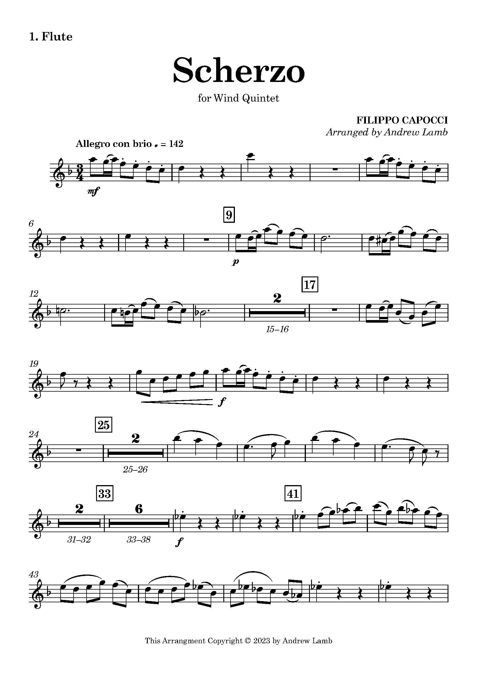 Experience the delightful and whimsical character of Filippo Capocci’s “Scherzo” in this beautifully arranged wind quintet adaptation. With a moderate level of difficulty, this piece is accessible for most intermediate ensembles, providing a charming addition to your concert repertoire.