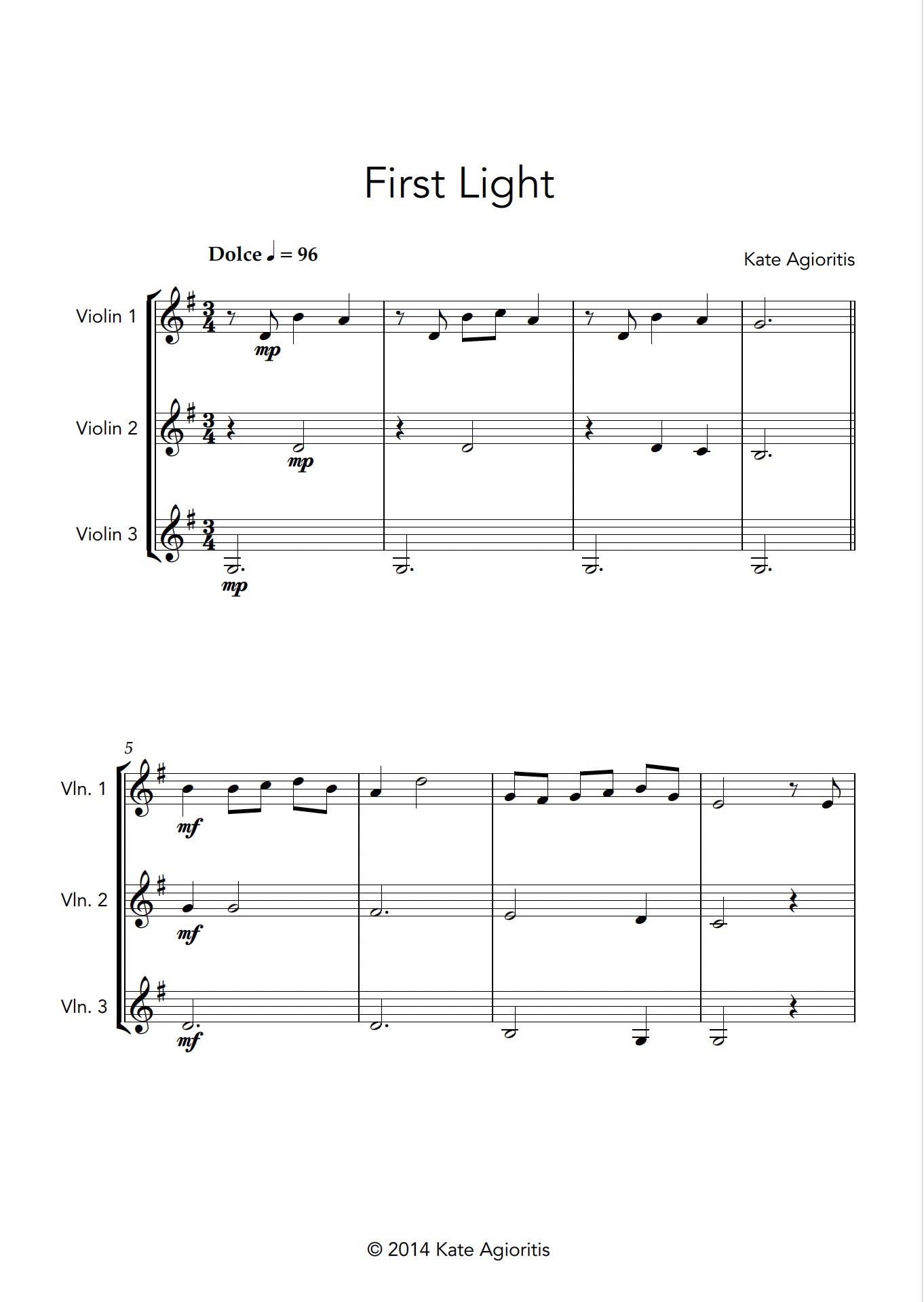 A delicate, modern classical piece in triple time, First Light is a great concert piece for developing/intermediate violinists. For Violin Trio (with optional viola – part 3)