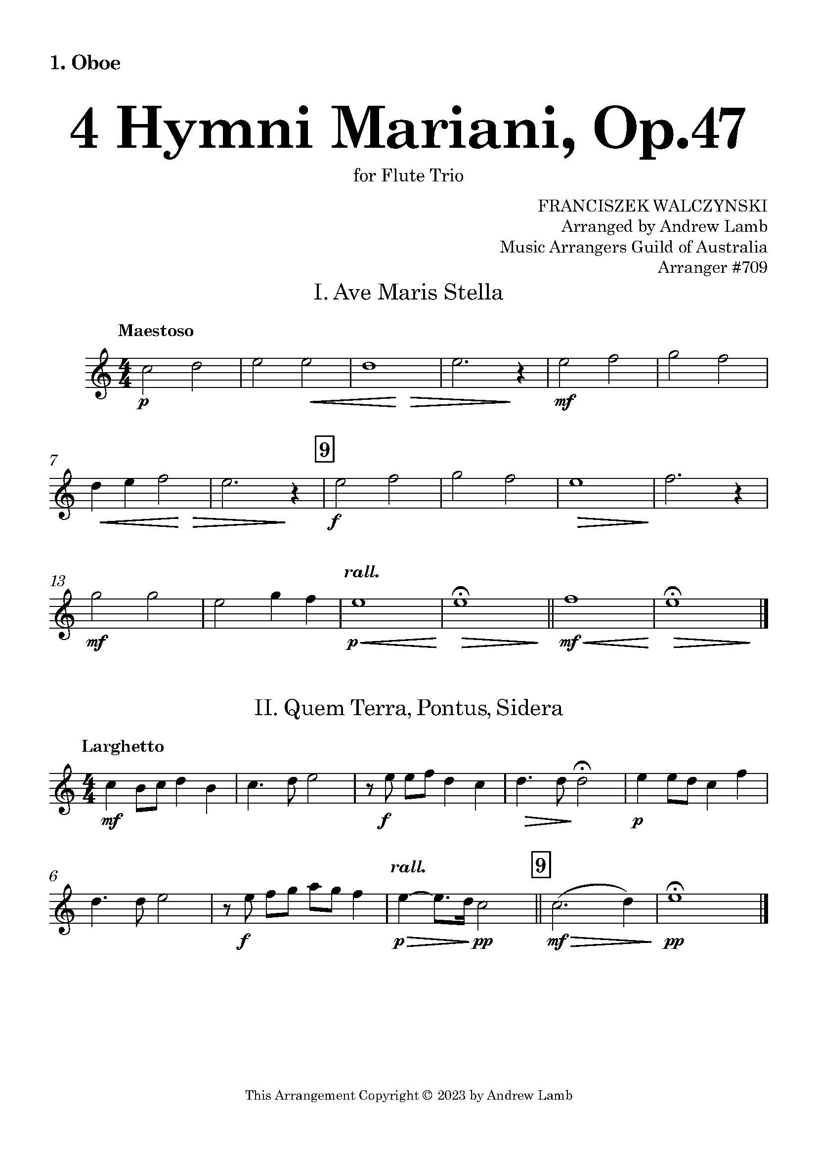🎶 Immerse yourself in the timeless beauty of Franciszek Walczyński’s “4 Hymni Mariani, Op. 47” with this enchanting Oboe/English Horn Trio adaptation! 🎶 Originally composed for three equal voices, this arrangement skillfully weaves the harmonies into a delightful tapestry for 2 Oboes and 1 English Horn. 🎼