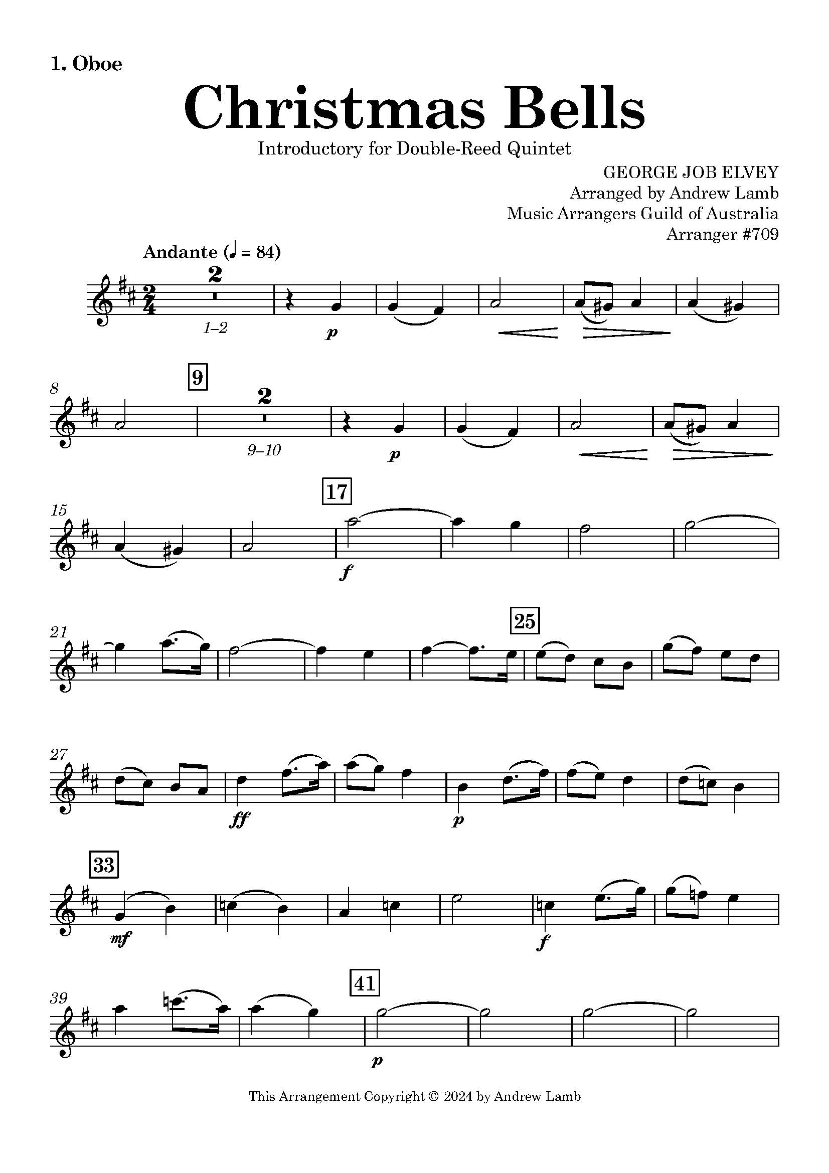 Presenting “Christmas Bells,” a heartwarming Double-Reed Quintet arrangement inspired by the classic composition of Englishman George Job Elvey. Originally crafted as an Introductory Voluntary for church services, this arrangement infuses new life into the timeless melodies, perfectly suited for the festive season and beyond.