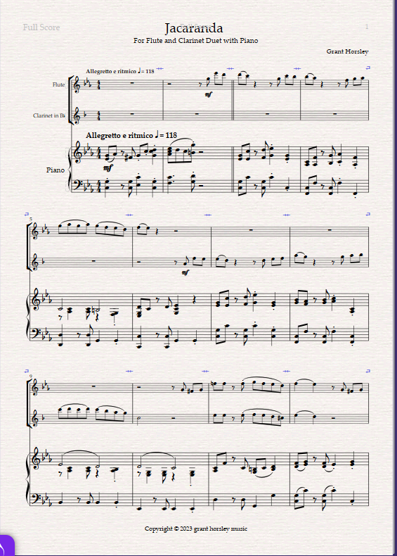 Jacaranda is in the key of concert C minor with the middle section in C major. The range is around two octaves and I have tried to keep both parts interesting and equal with shared moments of melodic and rhythmic interest. It also has wide dynamic contrasts and heavy accents, along with legato and staccato phrasing, all of which are effectively used in this genre.