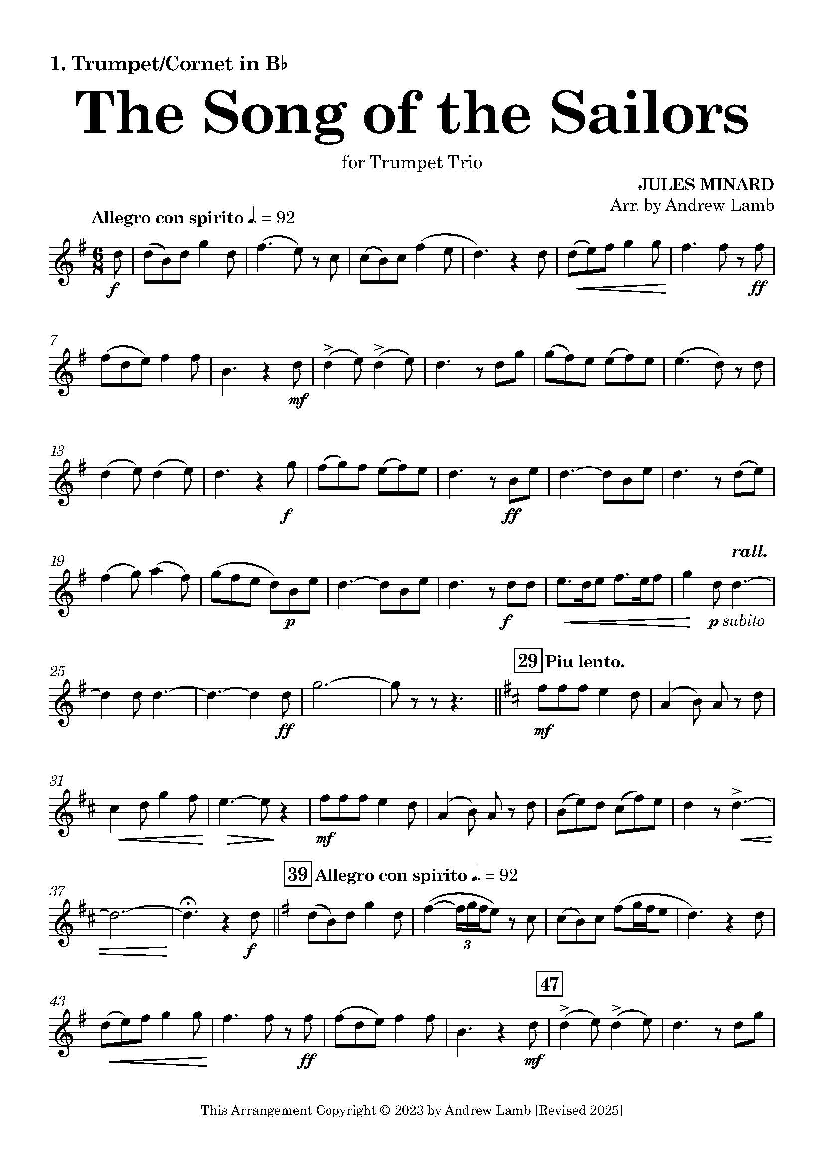 The work conjures images of wind-swept decks and distant horizons. This Trumpet Trio arrangement preserves the rhythmic vitality and melodic sweep of the original, while offering performers a chance to explore dynamic contrast and ensemble blend.