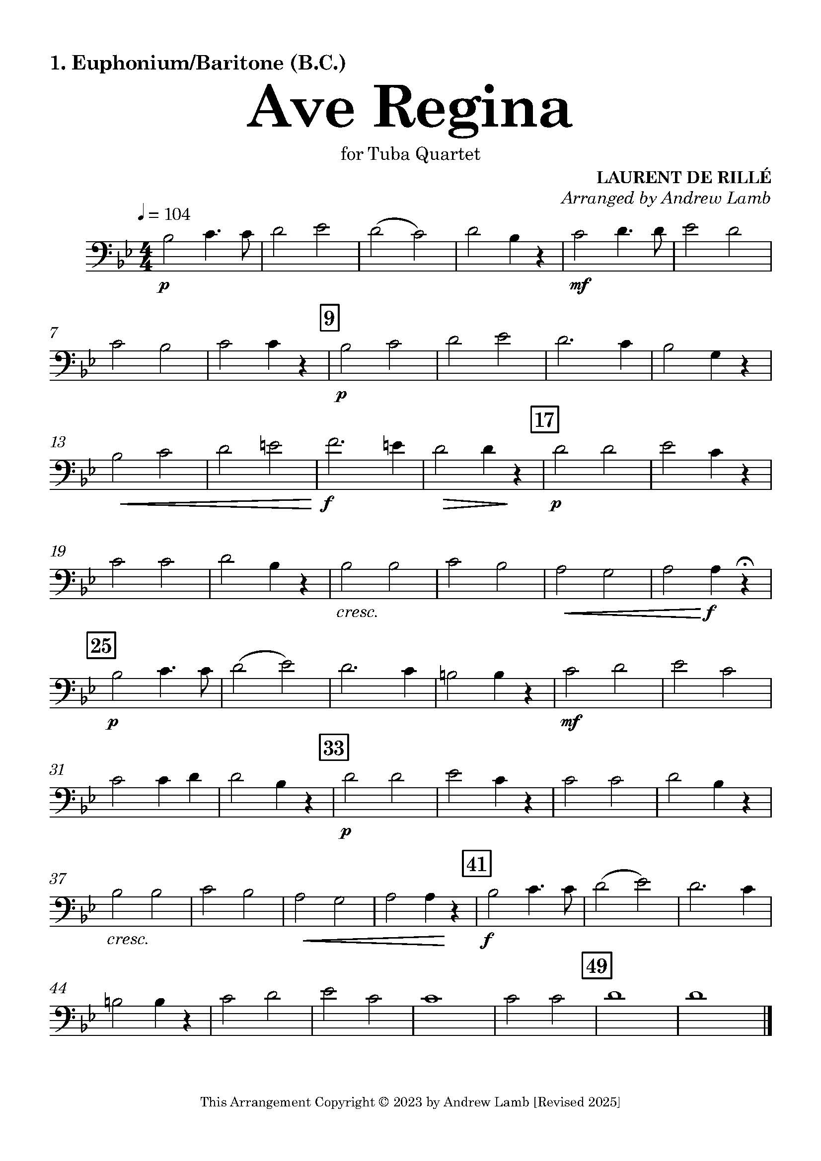 Introducing “Ave Regina” – a captivating arrangement for Tuba Quartet, crafted by the talented French composer, Laurent de RillĂ©. This sacred hymn and religious work have been thoughtfully adapted for 2 Euphoniums and 2 Tubas, creating a harmonious and resonant ensemble.