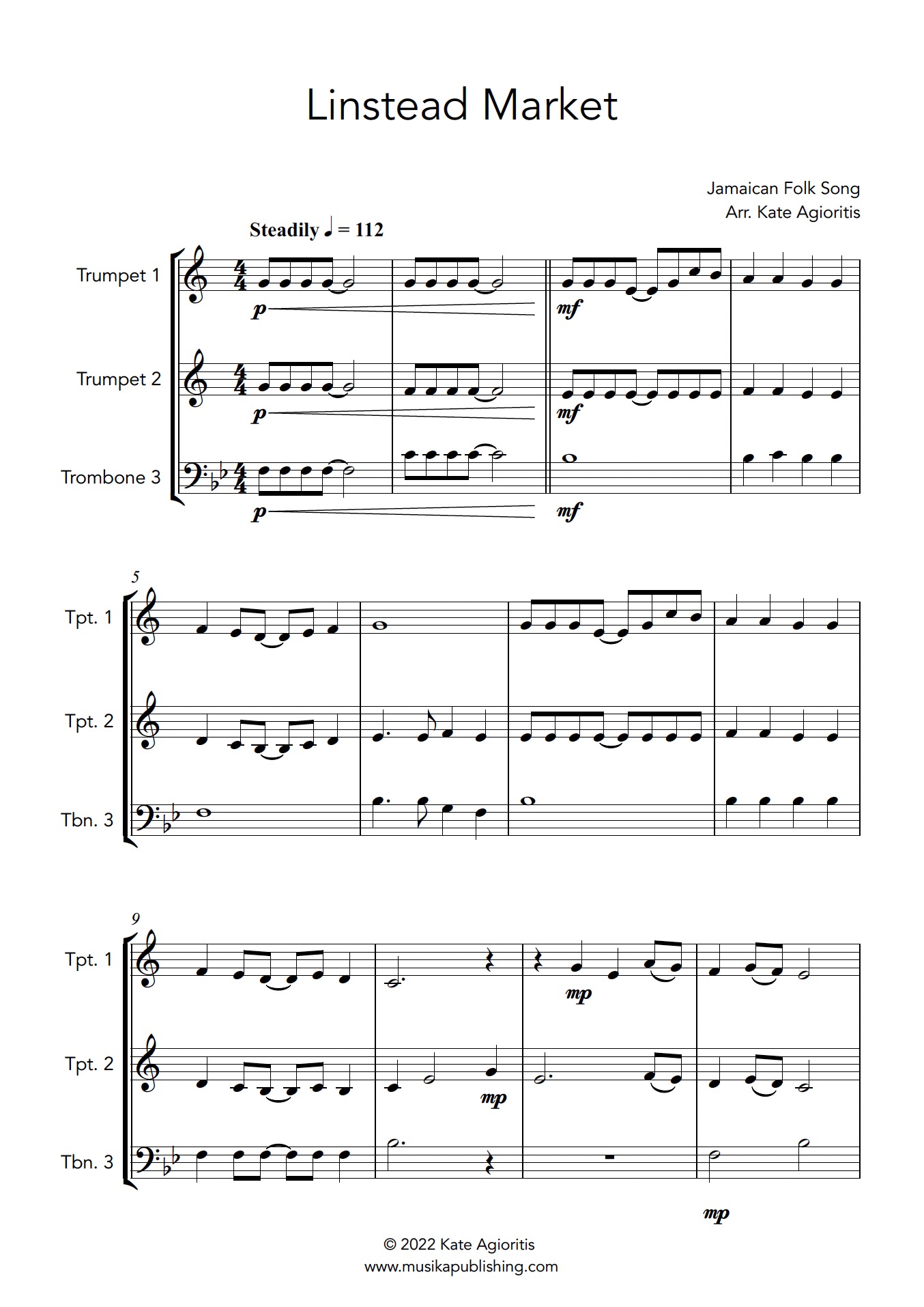 Bring the lively spirit of Jamaica to your next performance with this upbeat arrangement of the traditional folk song Linstead Market. Scored for Flexible Brass Trio, this version captures the tune’s infectious calypso feel while remaining accessible to early intermediate players. Light syncopation, catchy rhythms, and engaging interplay between parts make it a fun and rewarding piece for developing ensembles.