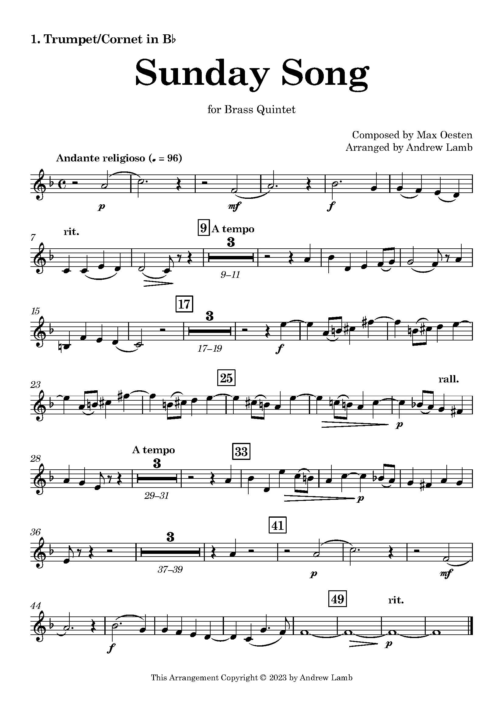 This brass quintet arrangement of Max Oesten’s Sunday Song is a uplifting musical piece that is sure to delight any audience. This arrangement expertly adapts the intricate melodies and harmonies of the original piece for the brass ensemble. This arrangement showcases the full range and versatility of the brass quintet, making it an excellent choice for both formal concerts and more casual performances. Whether you are a seasoned ensemble or a group of aspiring musicians, this arrangement is a must-have for anyone looking to add a touch of exuberance and cheer to their repertoire.