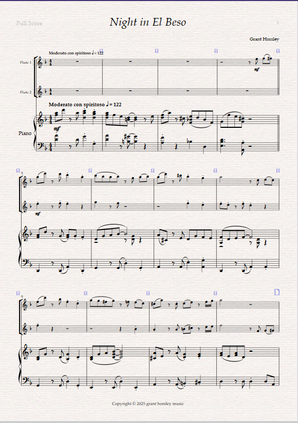 Written in concert D minor, I have tried to capture the essence of El Beso in this Tango from it’s syncopated rhythms to lyrical moments as well as a calming of the mood in the middle.