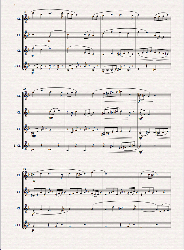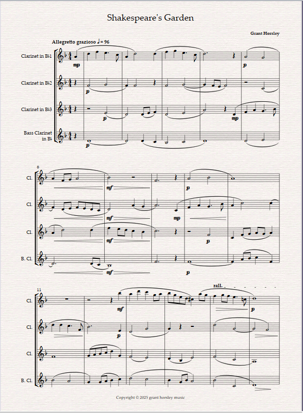 Shakespeare’s Garden is scored for 3 Bb Clarinets and Bass Clarinet. It is a very regal, stately piece in 4/4 time in ternary form- rather dance- like. It is intended to be a very graceful lyrical piece which has lots of legato lines, but punctuated at places by some delicate articulation in the accompanying parts.