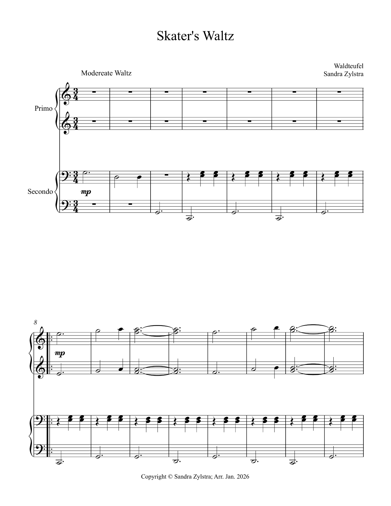 The “Skater’s Waltz” (Les Patineurs) is a famous waltz by French composer Émile Waldteufel. This waltz was composed to represent a winter day of ice skating in Paris. It’s one of Waldteufel’s most popular pieces. This piece is arranged as an intermediate piano duet in the key of C. (approximately 3 min., 4 pages) Arranged by: Sandra Zylstra