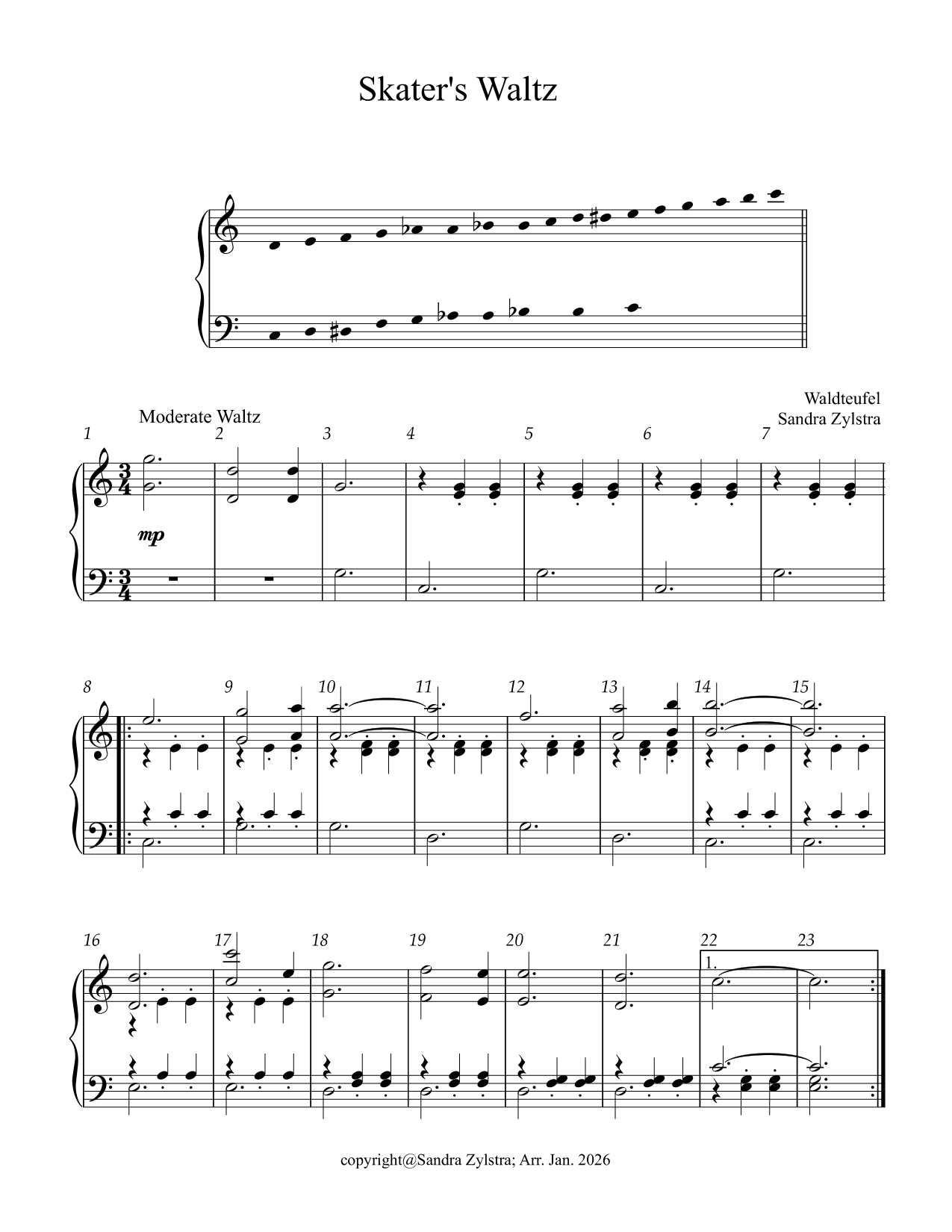 The “Skater’s Waltz” (Les Patineurs) is a famous waltz by French composer Émile Waldteufel. This waltz was composed to represent a winter day of ice skating in Paris. It’s one of Waldteufel’s most popular pieces. This arrangement is for 3 octaves, level 2 handbells, in the key of C. Purchase of this piece gives you permission to make copies for your bell choir only, it may not be duplicated for multiple groups. (approximately 3 min., 3 pages) Arranged by: Sandra Zylstra