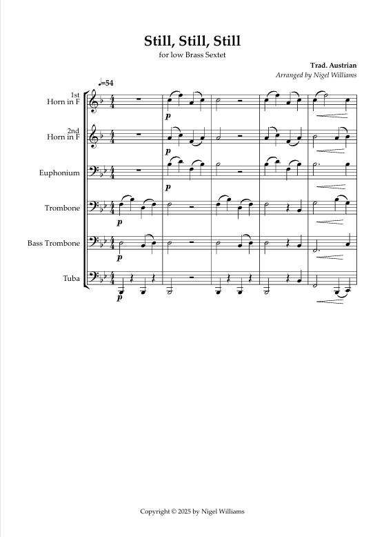 A beautiful arrangement of this gentle Austrian melody associated with the Christmas carol Still, Still, Still. The full score downloads with six individual parts attached, intermediate level.
