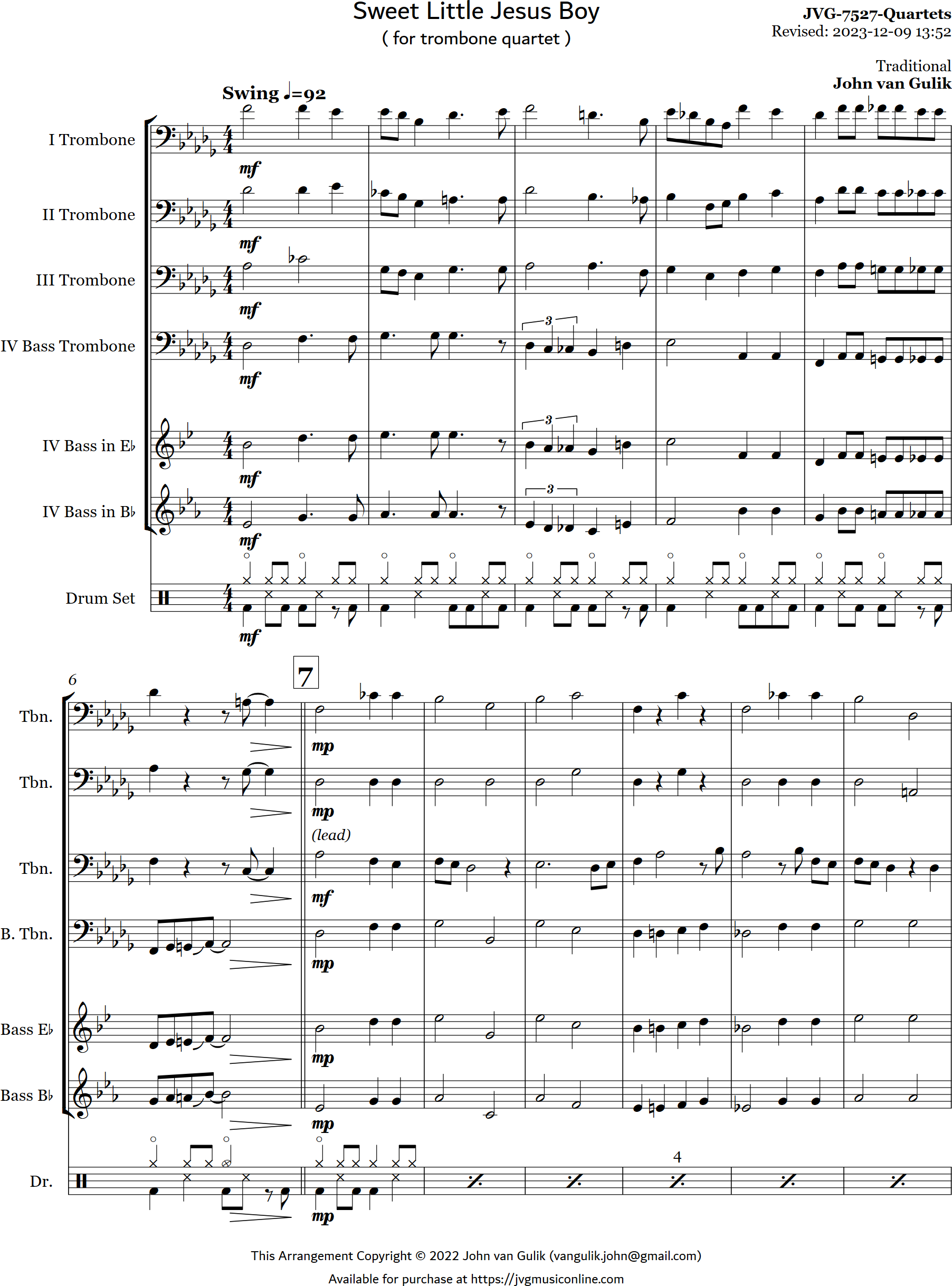 A much lesser known carol Sweet Little Jesus Boy is arranged here in a swing style for 4 trombones and optional percussion