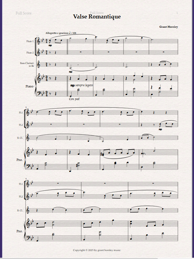 Valse Romantique for Wind Trio and Piano (2 Flutes and Bass Clarinet).