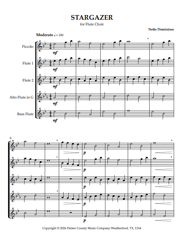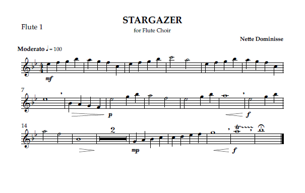 Stargazer is a great piece for beginner flute choirs, yet beautiful enough to showcase the velvety tones of advanced performers. Also makes a great warm up piece.