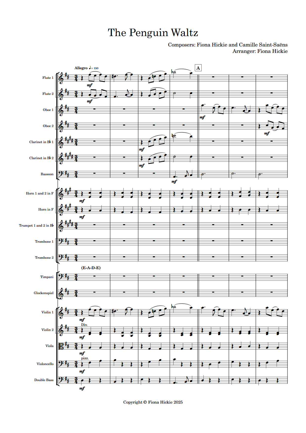 The Penguin Waltz is a piece about the penguin and is written for orchestra. Penguins are strange creatures; birds that are better in the water than on land, and don’t fly unless the propel themselves out of the water. This pieces shows the waddly, comical nature of the penguin, and uses Saint-Saens composition to show its grace in the water.