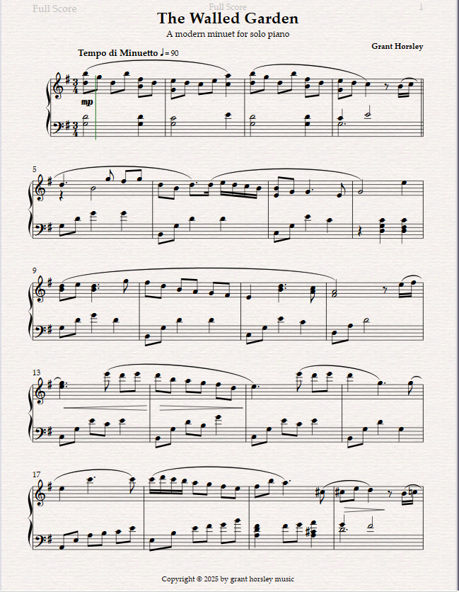This modern minuet is intended to be very graceful and lyrical like the minuets of the past and will work well if the articulation can be observed. Also it would be more characteristic if the strength of beats of the bar gradually decrease. I wanted to give it a more modern approach, so there are some major 7th chords used and some unusual chord progressions.