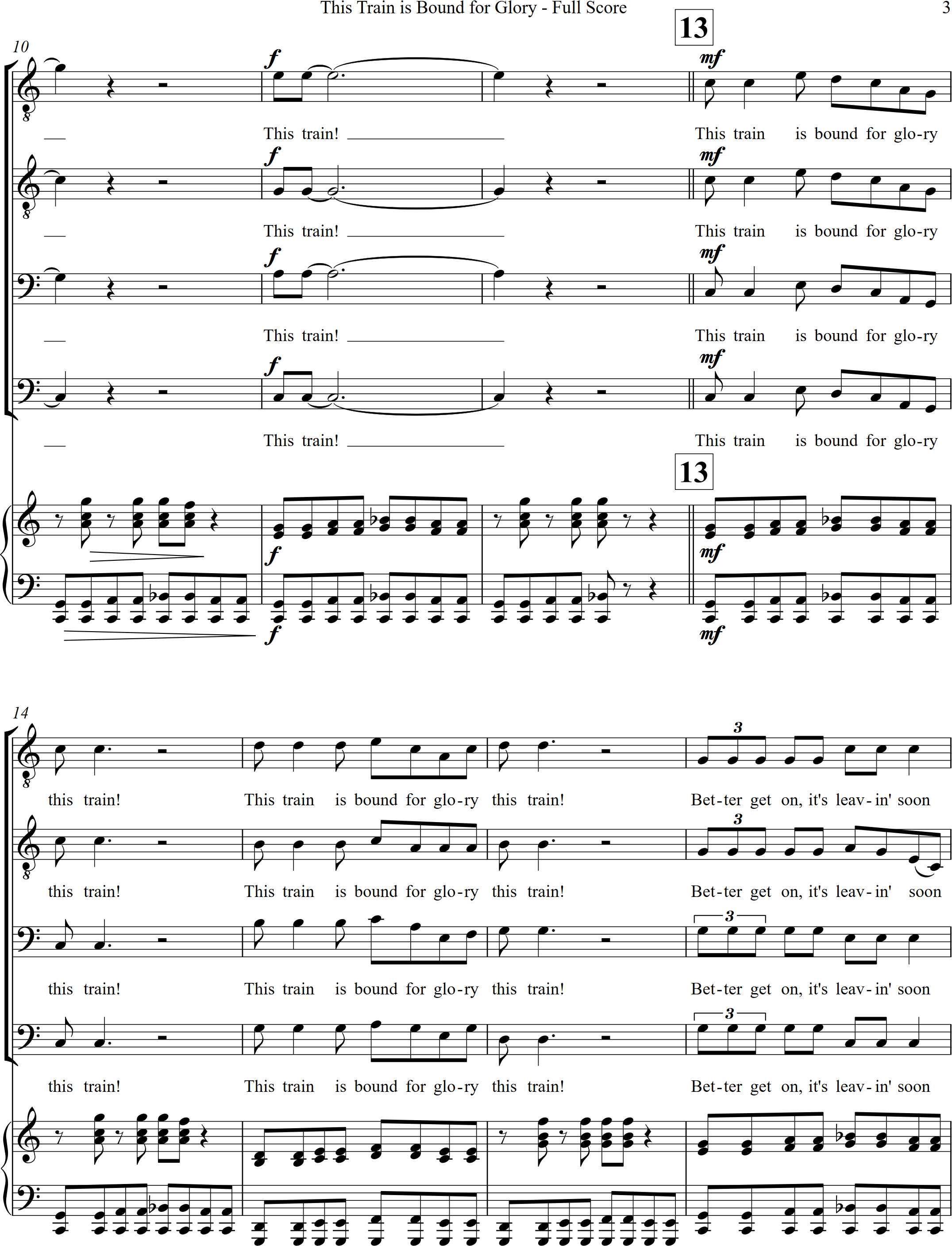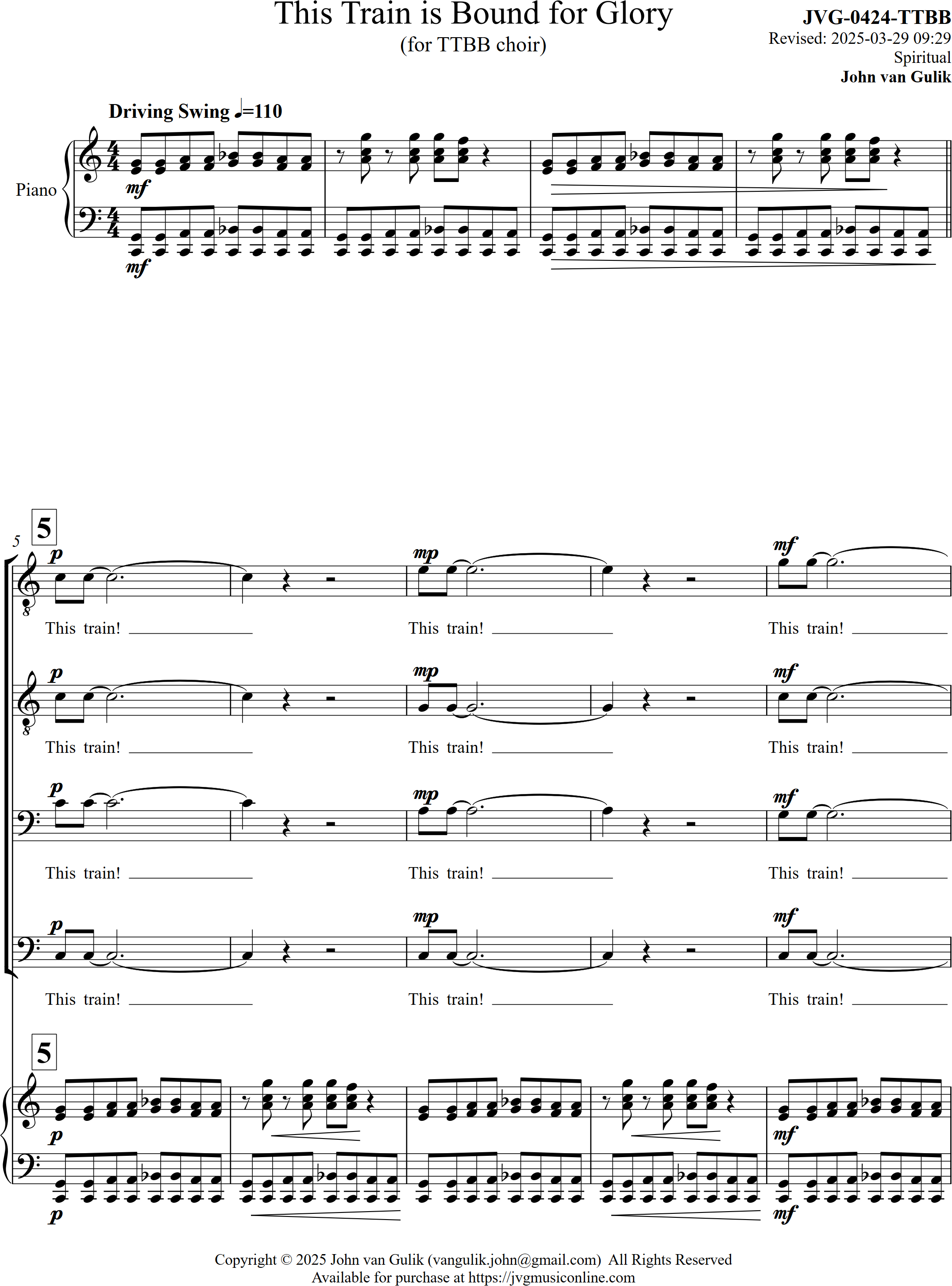 The classic Spiritual, This Train is Bound for Glory, is arranged here for TTBB choir in a driving swing style. A real fun unique arrangement.