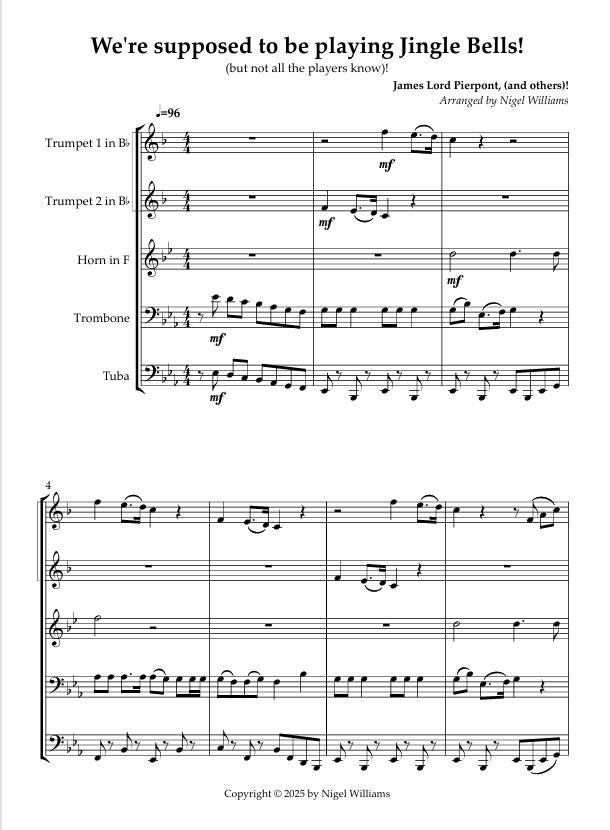 A fun Christmas holiday arrangement where some players want to play other carols! The trombone and tuba have it sorted, and the 2nd trumpet catches on pretty quickly, but the horn and first trumpet seem to want to play Joy to the World, O Holy Night, Deck the Hall, and Go Tell It! Eventually they work it out! Score downloads with parts attached, advanced intermediate level.